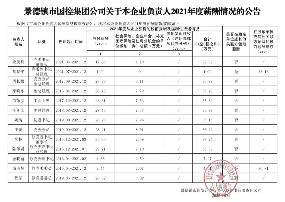 景德鎮(zhèn)市國(guó)控集團(tuán)公司關(guān)于本企業(yè)負(fù)責(zé)人2021年度薪酬情況的公告